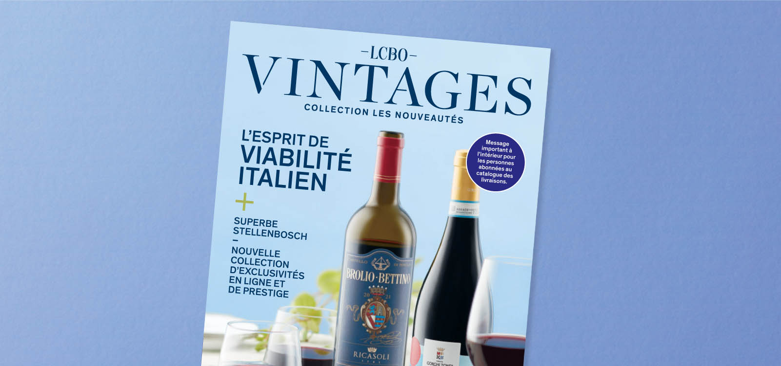 * Le montant minimum exclut la livraison et la taxe. Offre en vigueur du 5 novembre 2023 à 0 h (HNE) au 16 décembre 2023 à 23 h 59 (HNE). L’offre s’applique exclusivement aux achats en ligne ou sur l’appli de la LCBO, dans la limite des stocks. Les clients doivent sélectionner la livraison à domicile au moment de passer à la caisse. Valable pour la livraison standard ou le jour suivant (le cas échéant). Le code promotionnel est automatiquement appliqué à la caisse pour les commandes qui comprennent au moins un (1) produit admissible et qui respecte le montant minimal exigé. Les clients doivent être âgés d’au moins 19 ans. Les produits ne sont pas représentés à l’échelle. Les images de produits sont fournies à titre indicatif seulement et pourraient ne pas représenter fidèlement le produit réel. Les prix peuvent changer sans préavis. Le millésime indiqué sur l’image du produit pourrait être différent de ce que nous avons en ligne. Les cartes-cadeaux ne sont pas admissibles pour la livraison gratuite dans le cadre de cette promotion. La promotion ne s’applique pas aux produits de la collection Les essentiels de Vintages.
